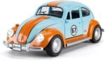 A stylish die-cast toy car inspired by the classic Volkswagen Beetle design, featuring a vintage look with smooth detailing, bright dual-tone colors, and realistic wheels—perfect for kids’ play or display collections.