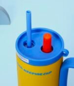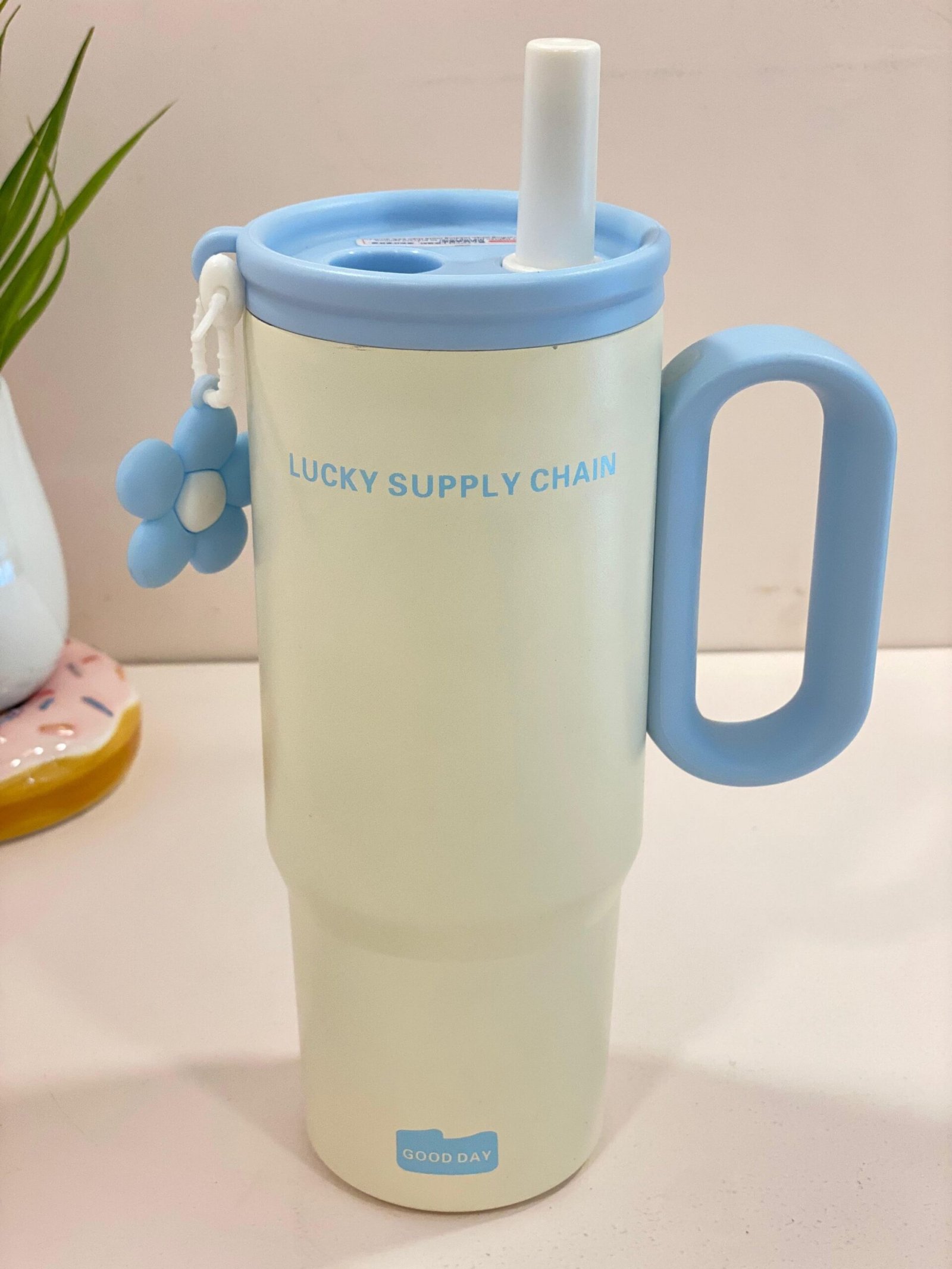 A stylish and functional double-walled insulated tumbler designed for maximum portability. Featuring a sleek cream body with pastel blue accents, this mug includes a sturdy ergonomic handle, a splash-resistant lid with a matching straw, and a decorative flower charm. Perfect for keeping beverages at the desired temperature for hours, whether at home, the office, or on the go.
