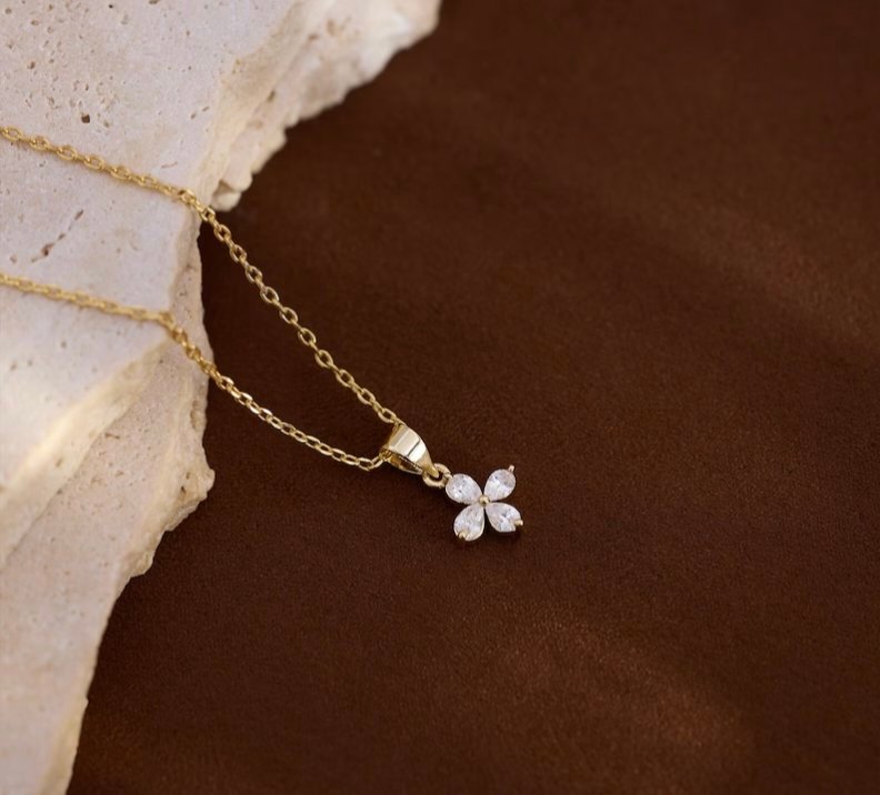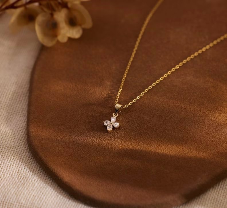 Embrace a touch of timeless elegance with the ZIVU ZIYU “Exquisite Luxury Selection” Pendant Necklace. This piece is designed for those who appreciate delicate craftsmanship and subtle sparkle. The necklace features a slender, high-polish gold-tone chain that gracefully leads to a central four-petal floral pendant. Each petal is meticulously set with clear zirconia crystals, creating a brilliant light-catching effect with every movement.
