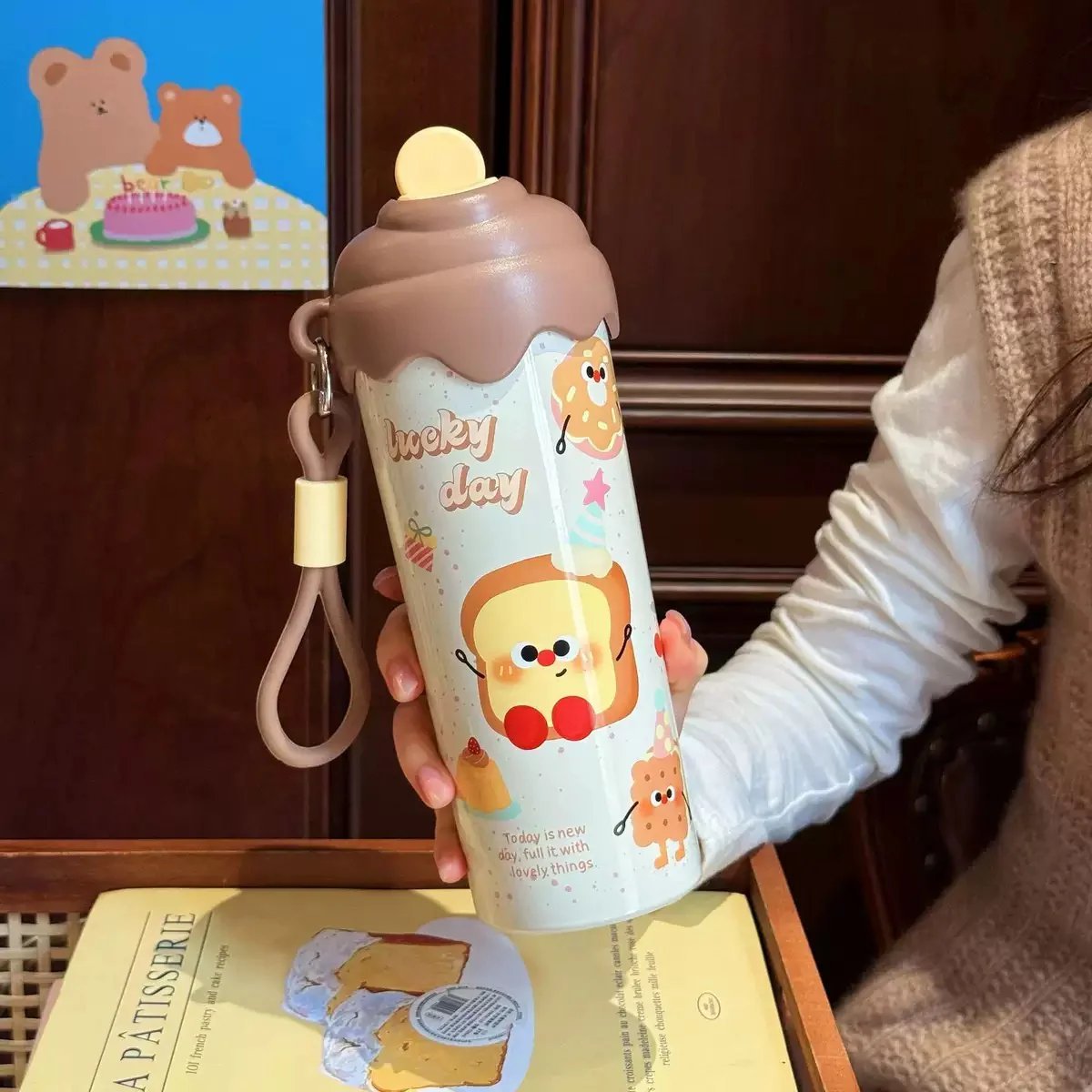 This charming insulated water bottle features a whimsical “sweet treats” theme, designed with a lid that mimics the look of melting icing or a dollop of cream. Decorated with adorable illustrations of cakes, donuts, and pastries, it is an ideal accessory for students or anyone who enjoys “kawaii” (cute) aesthetics.