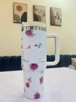 Kiddonindia Floral Pattern Stainless Steel Tumbler with Lid and Straw, Hot and Cold Double Insulated Sipper Mug, Leak Proof Coffee Tumbler for Office, Gym, Travelling (White)