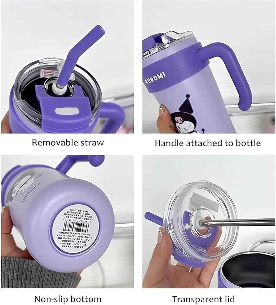860ML Stainless Steel Tumbler with Straw, Vacuum Insulated Coffee Tumbler, Purple Kuromi Character Design, Leakproof Wide Mouth Sipper Bottle for Gym, Office, Sport, Travel (Purple)