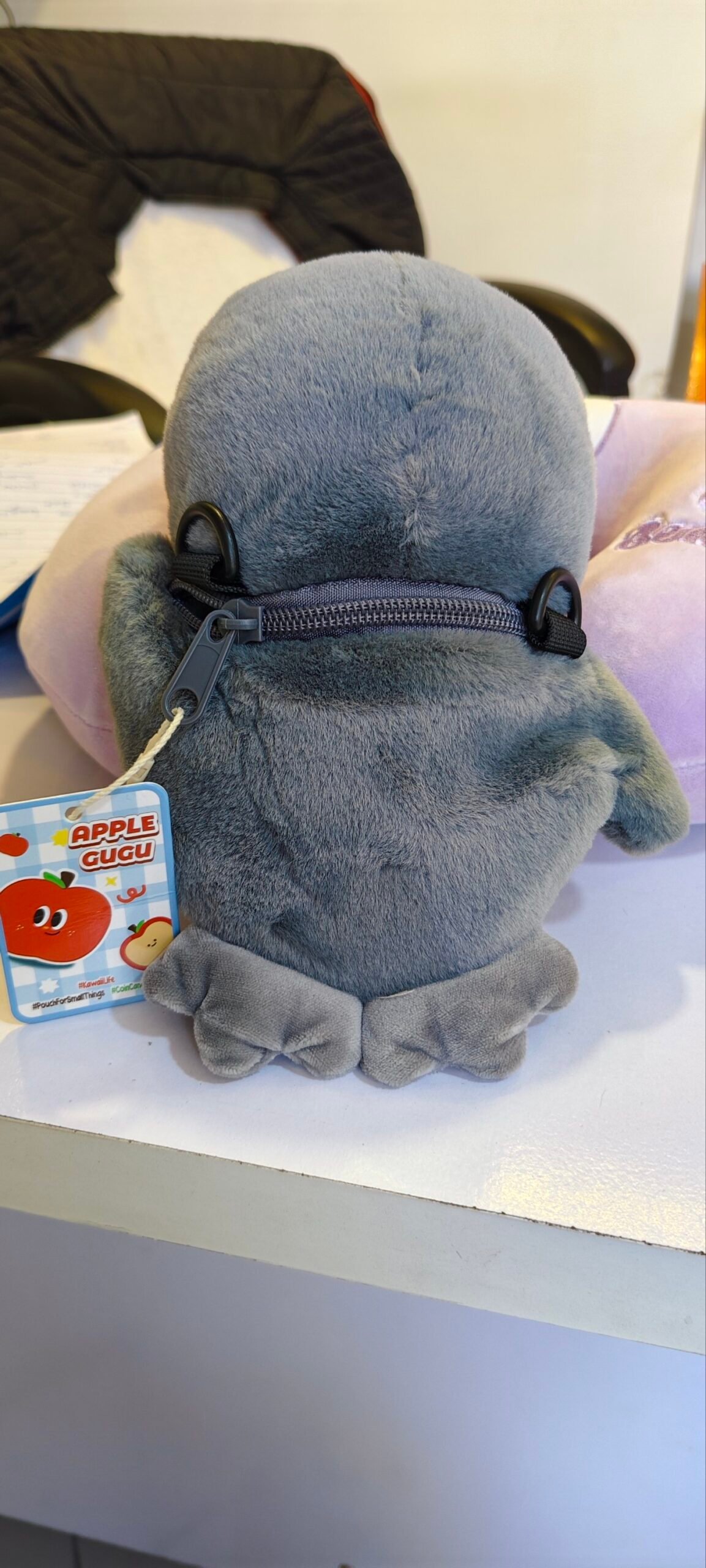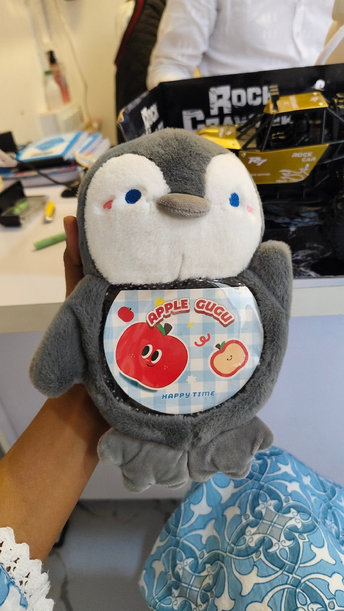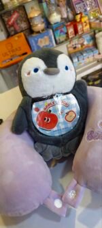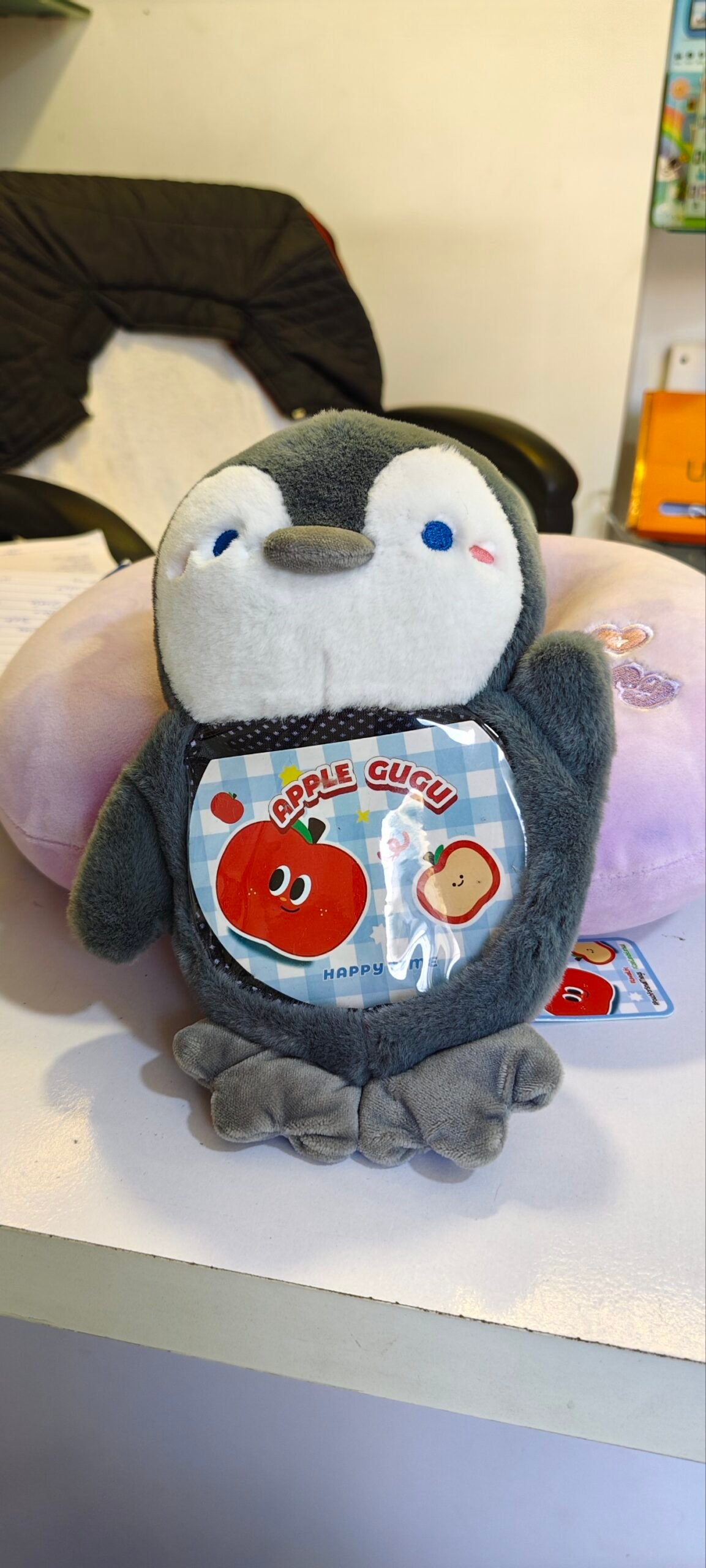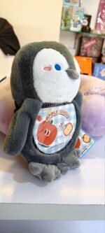 This image shows a cute, soft plush penguin toy placed on a shop counter. The penguin is grey and white with a round face, small blue eyes, a tiny beak, and pink blush marks on its cheeks, giving it an adorable expression. On its belly, there is a colorful circular patch with a cartoon apple and bread illustration along with the words “APPLE” and “HAPPY TIME.”