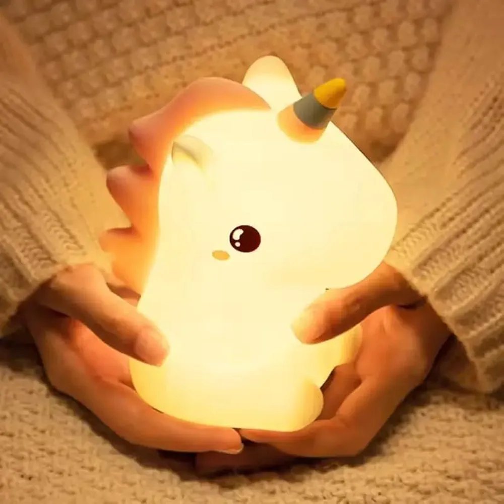 DESIGN: Adorable unicorn-shaped night light crafted from soft, child-safe silicone material with a cute face and colourful horn detail